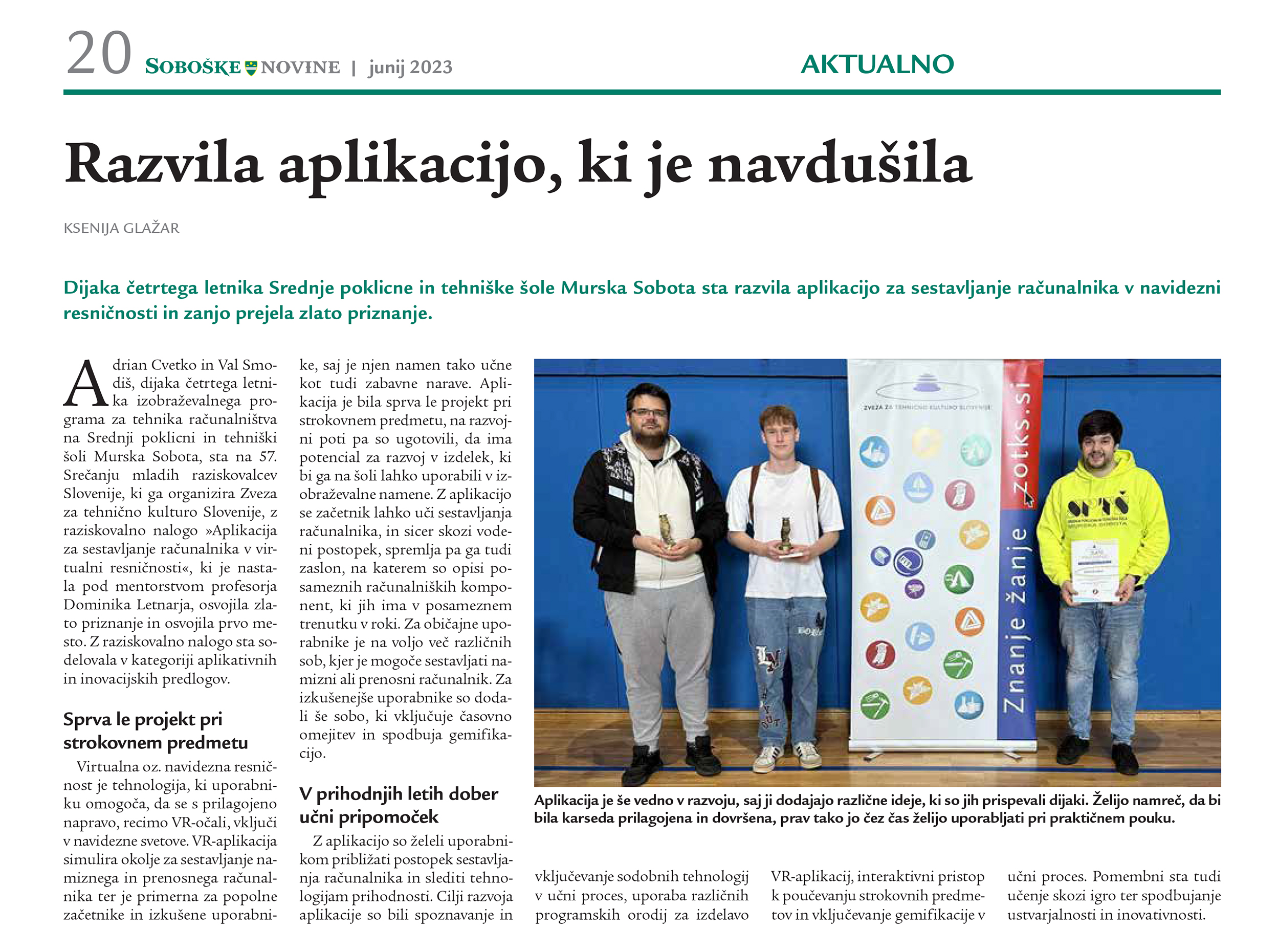 Spletni medij sobotainfo.com poroča: "Dijaka pomurske šole zablestela z VR aplikacijo in prejela zlato priznanje".